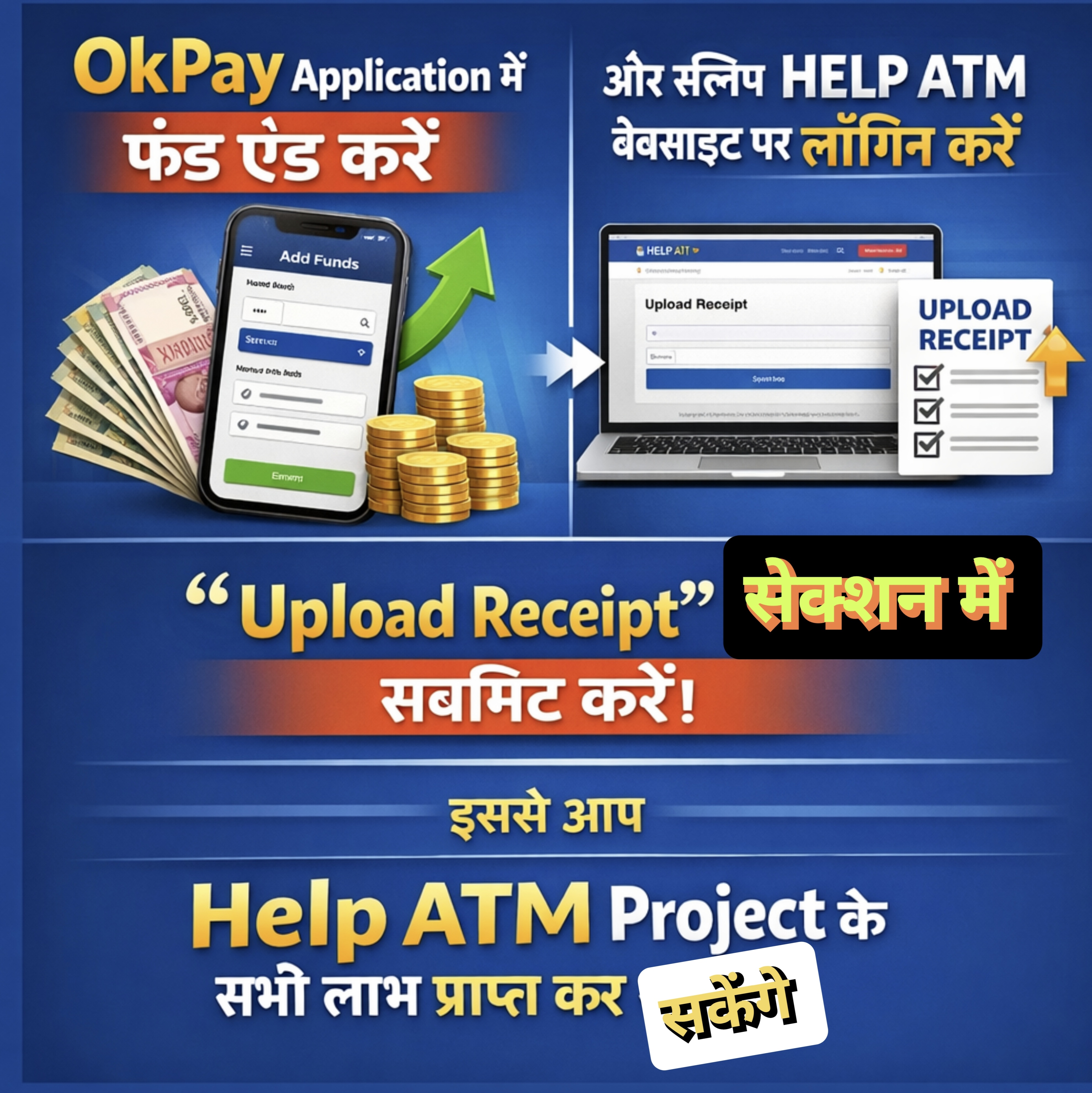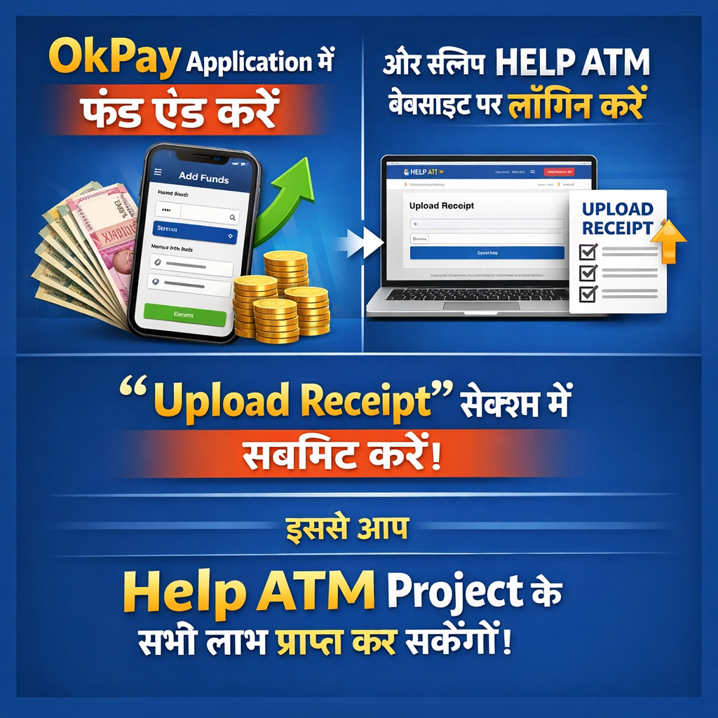 OkPay Application में फंड ऐड करें और उसकी स्लिप HELP ATM वेबसाइट पर लॉगिन करके “Upload Receipt” सेक्शन में सबमिट करें। इससे आप Help ATM Project के सभी लाभ प्राप्त कर सकेंगे।