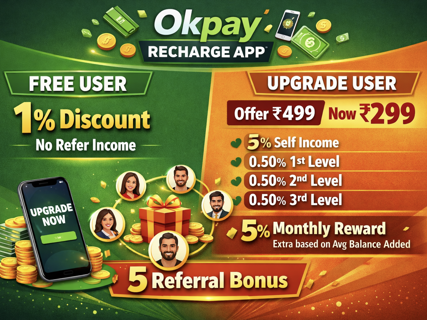 OkPay Recharge App में Free User को 1% Discount और सिर्फ ₹299 में Premium User बनकर 5% Self Income और 3 Level Income मिलता है। साथ में Monthly Reward और Video Watching Income भी।✔️ https://okpay.co.in/App/okpay.php?ref=450E19