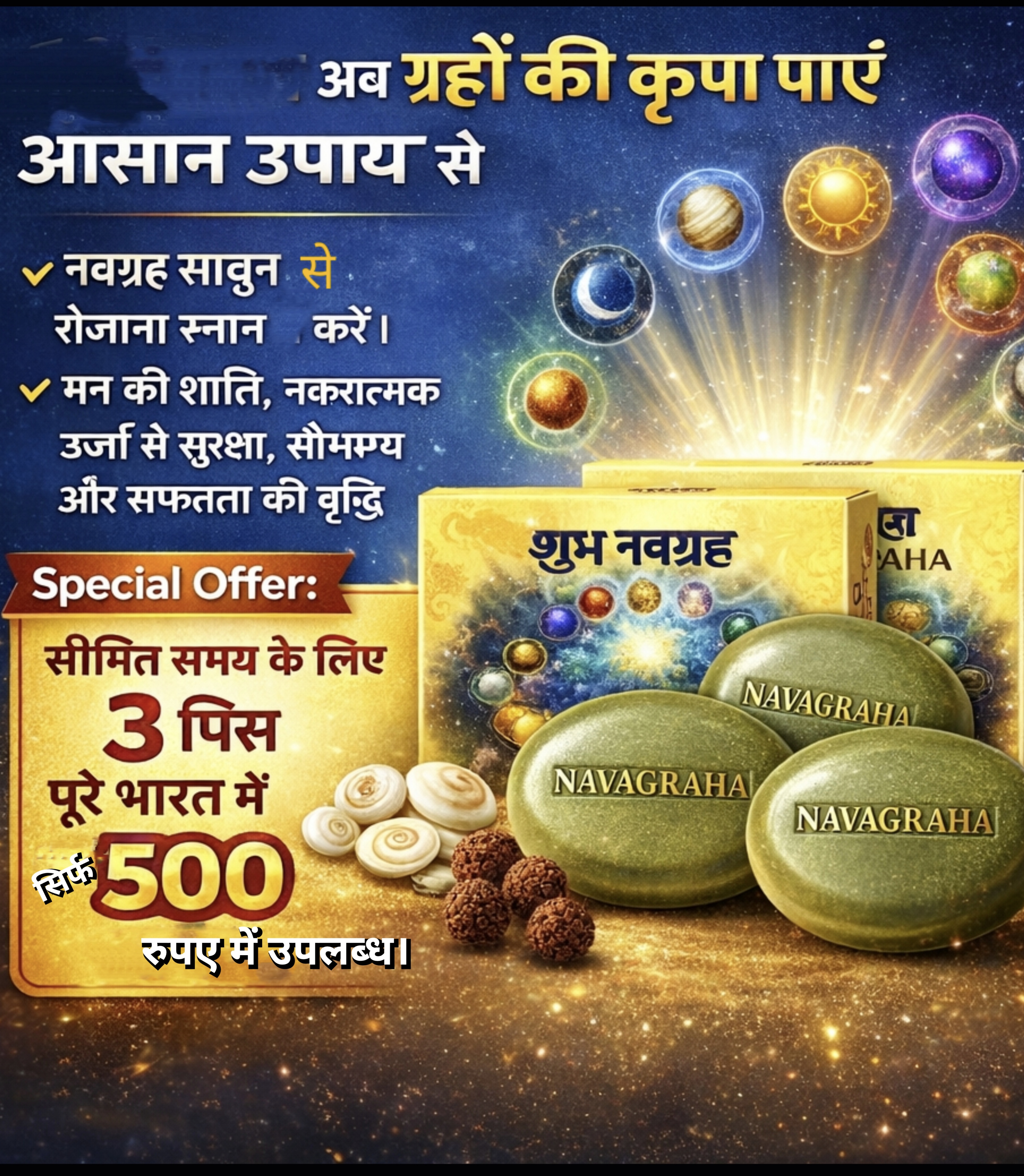 100 ग्राम अब ग्रहों की कृपा पाएँ आसान उपाय से — नवग्रह साबुन रोजाना स्नान में करें । — मन की शांति, नकारात्मक ऊर्जा से सुरक्षा, सौभाग्य और सफलता की वृद्धि Special Offer: सीमित समय के लिए 3 पिस पूरे भारत में
